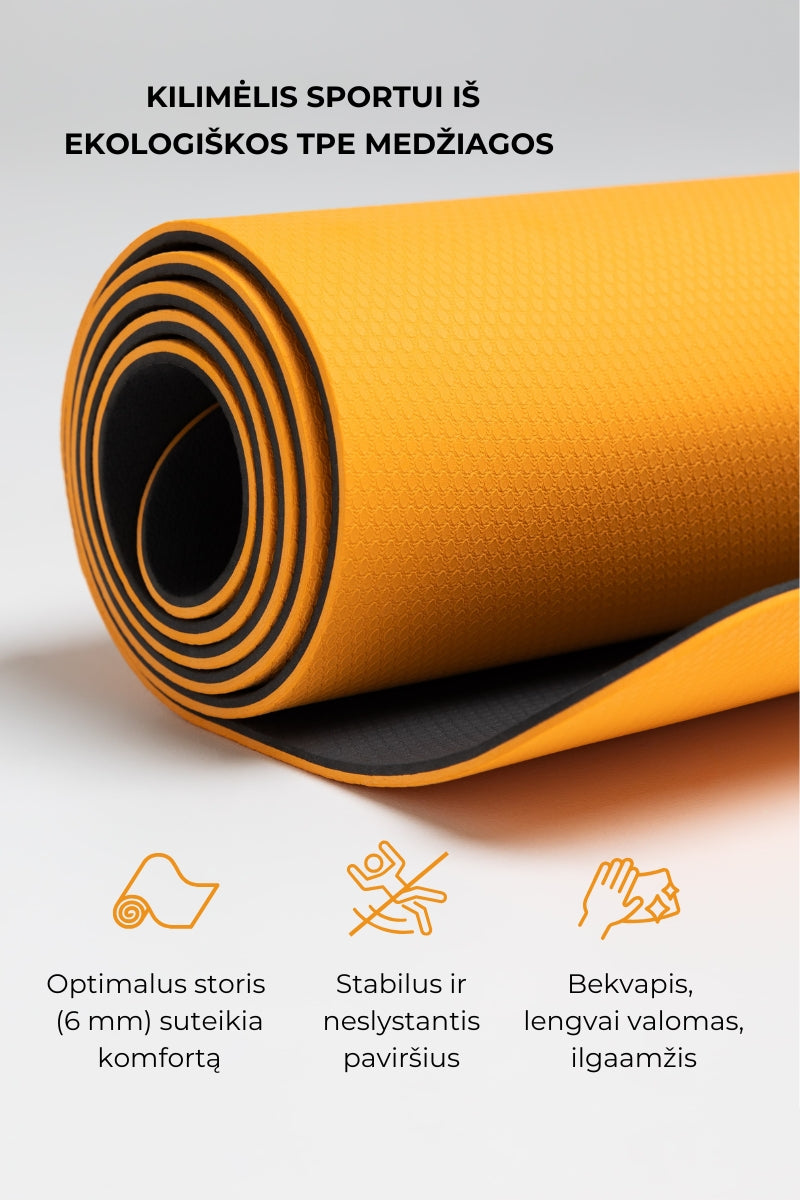 • Optimalus 6 mm storis suteikia komfortą visam kūnui: saugo sąnarius, atramas ir leidžia treniruotis be diskomforto.