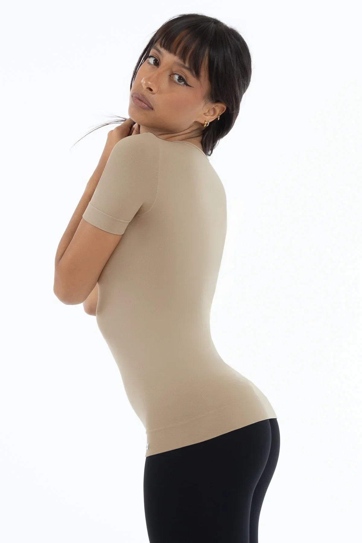 „Miss” kreminės rudos spalvos klasikinio stiliaus marškinėliai pagaminti iš lengvo, drėgmę sugeriančio ir orui pralaidaus audinio, kuris užtikrina gaivumą ir sausumą net intensyvių treniruočių metu. Šie marškinėliai maloniai priglunda prie kūno, išryškindami natūralias linijas, tačiau nevaržo judesių ir suteikia komforto pojūtį.