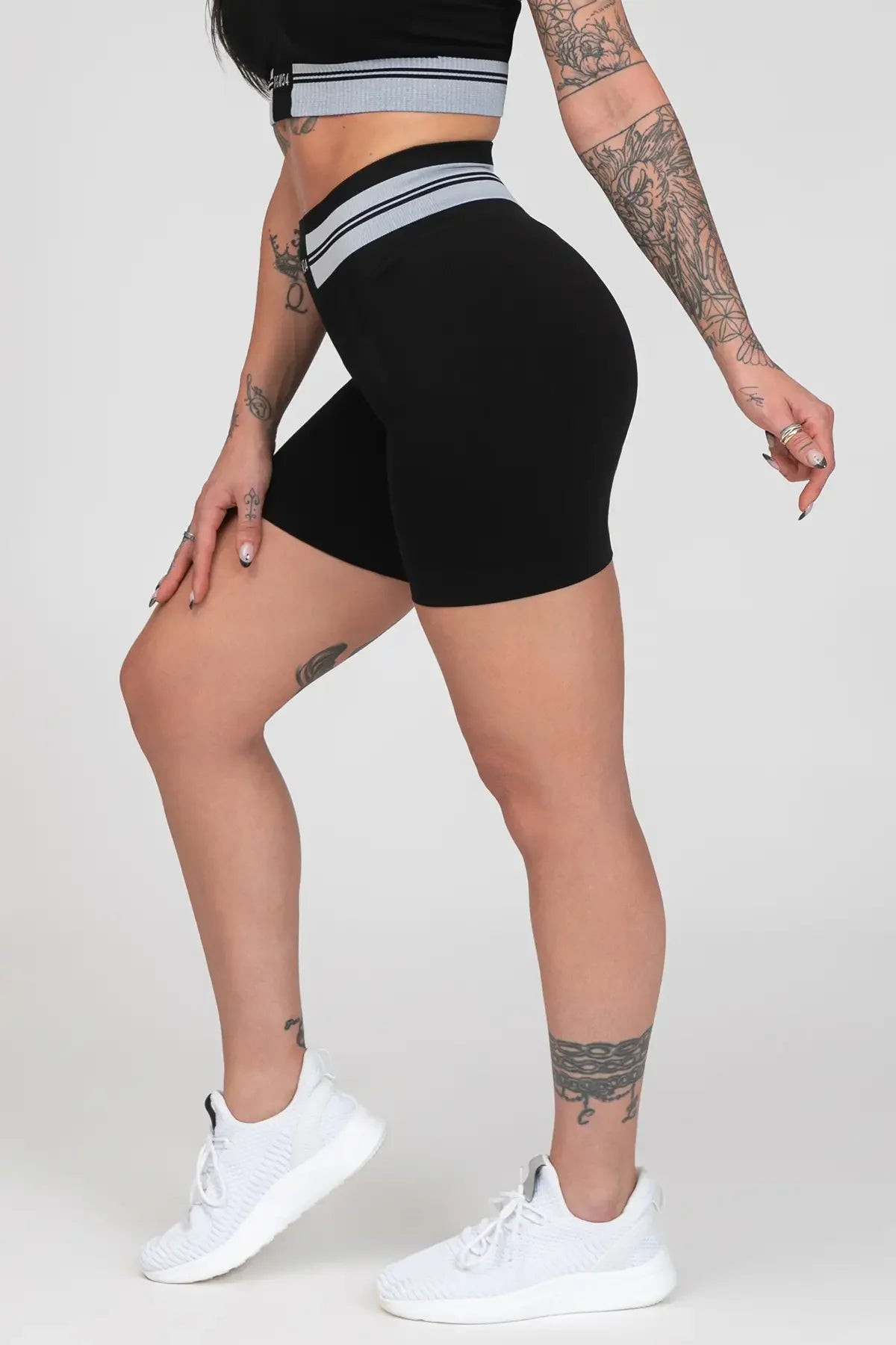 Šie šortai puikiai dera su įvairiomis sportinėmis liemenėlėmis ar palaidinėmis bei marškinėliais.