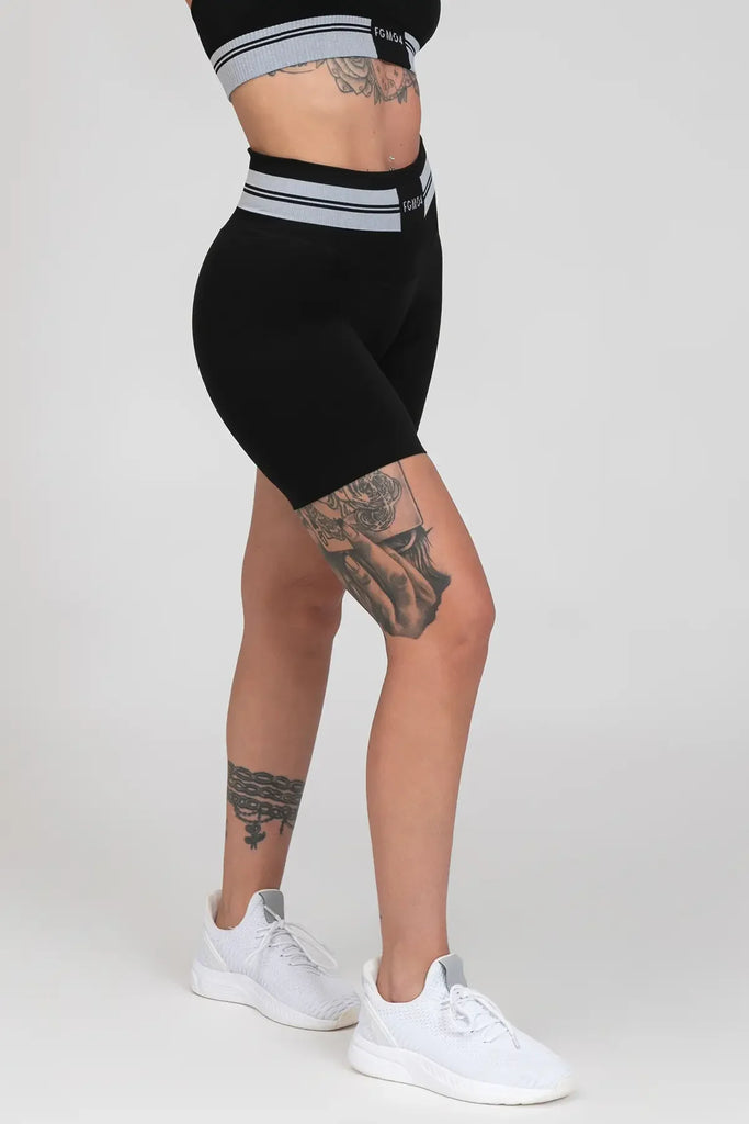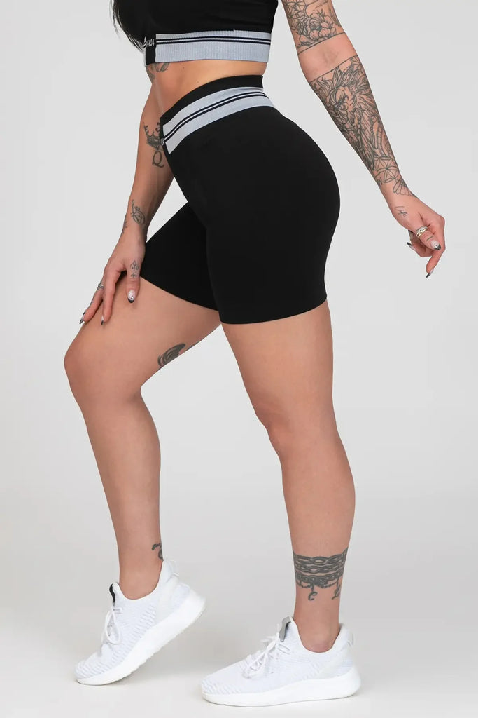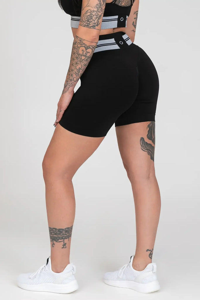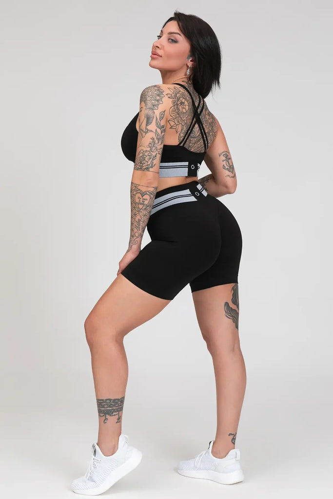 Šortai išsiskiria unikaliu dizainu su kontrastingomis juostelėmis, suteikiančiomis modernumo ir išraiškingumo. Paaukštintas liemuo maloniai priglunda, nespaudžia ir nevaržo, o „Push-up" efektas dailiai formuoja sėdmenis.
