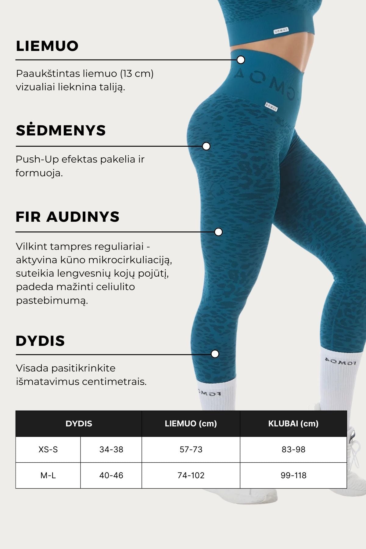 - · Dėl „Push-Up" struktūros išryškina ir suformuoja sėdmenis