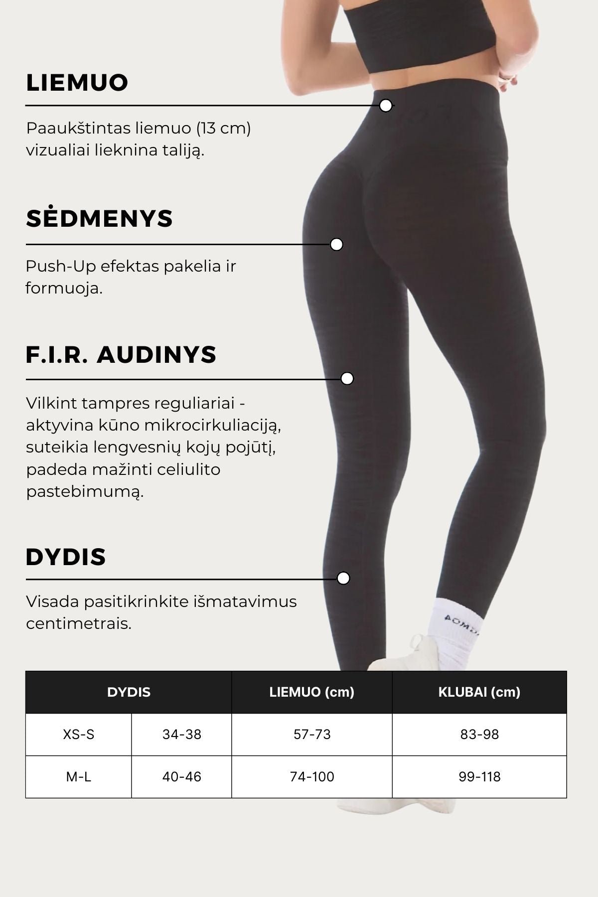 - · Dėl „Push-Up" struktūros išryškina ir suformuoja sėdmenis